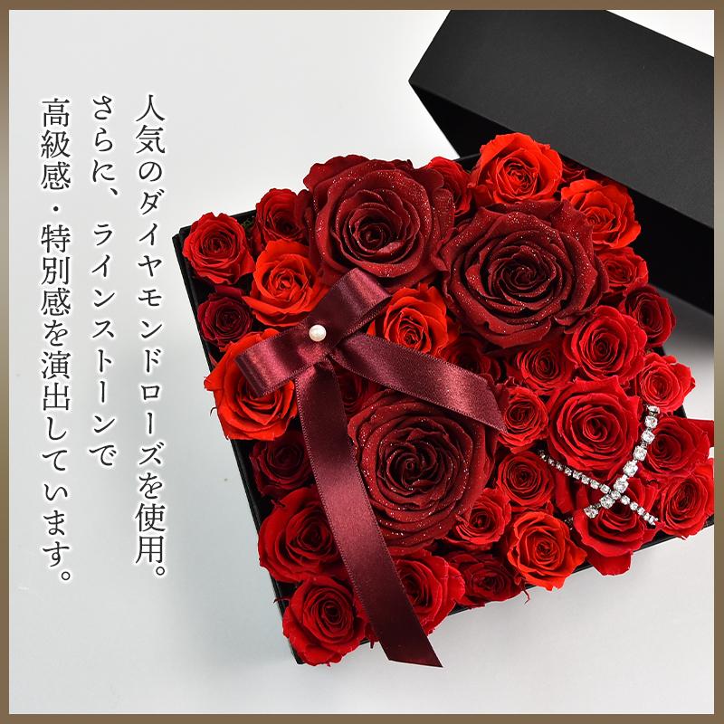 人気のダイヤモンドローズを使用したプリザーブドフラワーのフラワーボックス。 33本のバラには「生まれ変わっても一緒にいたい」という意味があり、プロポーズにぴったりなフラワー