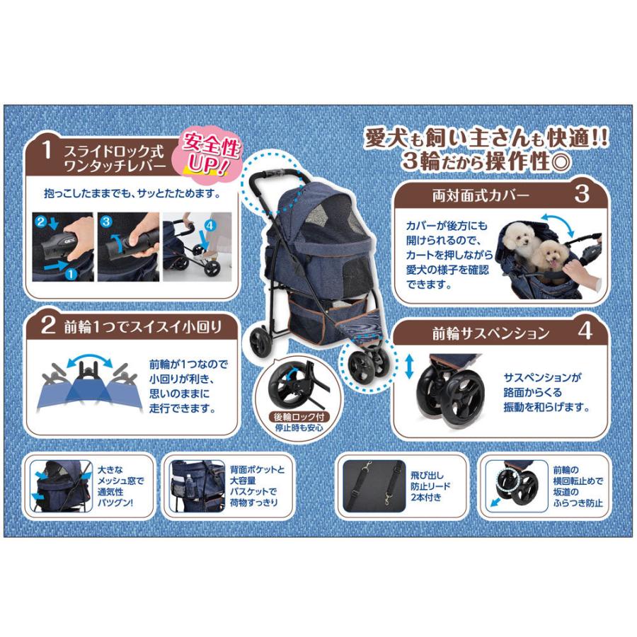 商品情報 サイズ(最大値):使用時:約幅49.0×奥行81.5×高さ95.0cm 収納時:約幅49.0×奥行25.0×高さ103.0cm *詳細は画像をご覧下さい。 重量:約5.2kg 対象:超小型犬、小型犬(2頭まで) 材質:本体バスケット:ポリエステル フレーム:スチール 耐荷重:本体バスケット:12kg 収納バスケット:2kg 保証期間:1年 セット内容:本体、取扱説明書兼保証書 生産国:中国 商品区分:犬用カート/キャリーカート/バギー 操作性の良い3輪タイプ:3輪で小回りが利きやすくスイスイ移動。前輪が1つだから進行方向が定まりやすく、安定走行ができます。 片手でたためる:折り畳みはスライドロック式ワンタッチレバーを握って回すだけのワンタッチ! 振動軽減&段差ラクラク:ソフトタイヤ&前輪サスペンション採用で、路面からくる振動を軽減してくれます。タイヤは大きめのものになっており、デコボコや段差もすっと乗り越えることができます。 本体バスケットは12kgまで可:ワンちゃんが入るバスケット部分は、小さめのワンちゃんなら2頭でもOK。前面はメッシュになっており、通気性に配慮。 (詳細は下記商品説明をご覧下さい) |