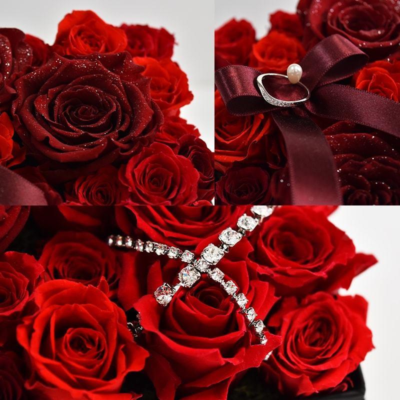 人気のダイヤモンドローズを使用したプリザーブドフラワーのフラワーボックス。 33本のバラには「生まれ変わっても一緒にいたい」という意味があり、